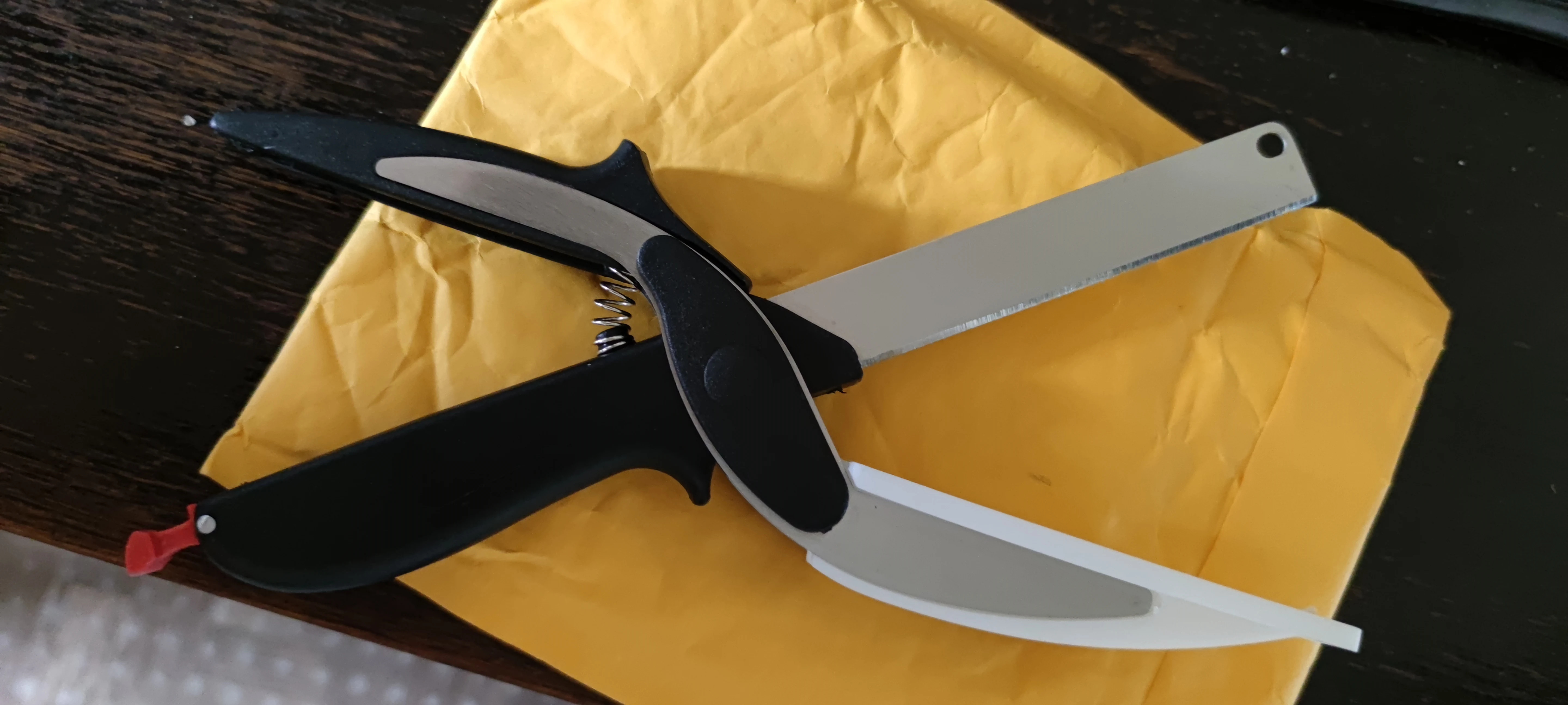 Esta tijera con tabla de cortar se puede utilizar para múltiples propósitos. Es muy afilada, bien diseñado y compacto. Puedes separar los cuchillos.